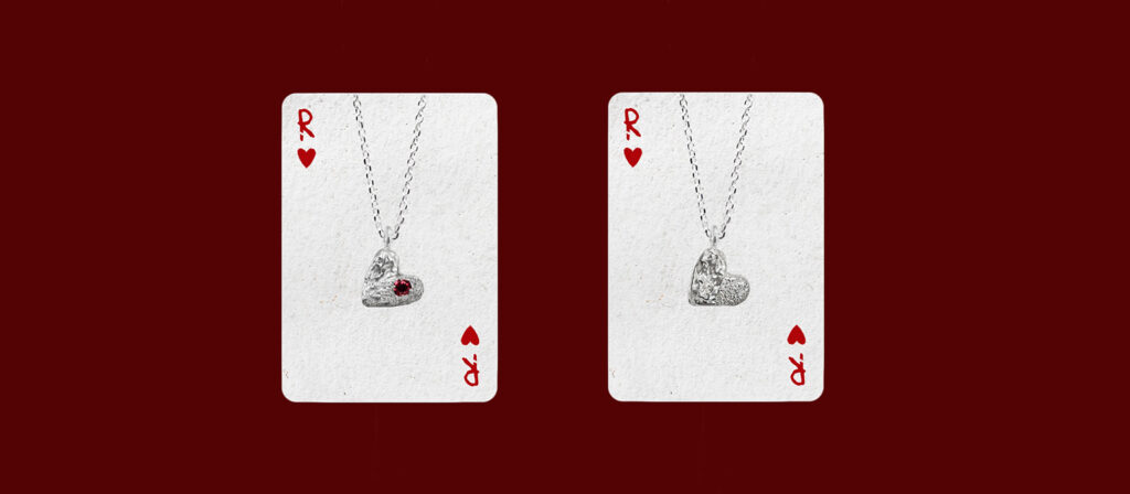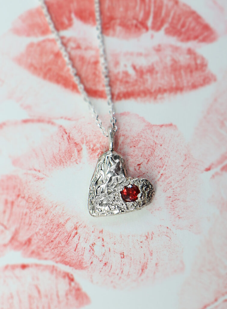 Naszyjnik w kształcie serca, ma nieregularny kształt – to takie małe przypomnienie, że piękno tkwi w niedoskonałościach. A w jego jednej części umieszczony jest czerwony granat, kamień kojarzony z miłością, pasją i bliskością. Naszyjnik jest przez nas ręcznie rzeźbiony w wosku jubilerskim, a następnie odlewany metodą wosku traconego.