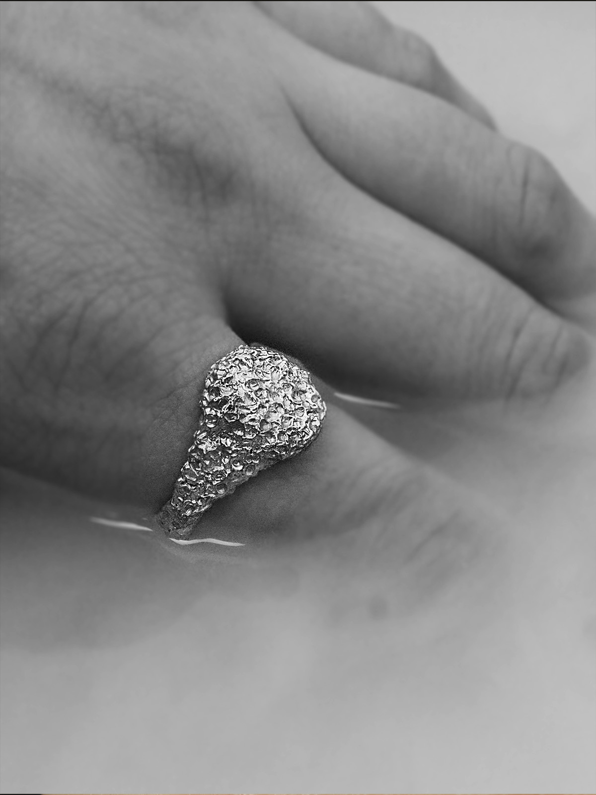 Pierścionek Crush to sygnet, którego powierzchnia przypomina zgniecioną folię aluminiową. Nieregularne załamania, wklęsłości i wypukłości tworzą ciekawą strukturę, która za każdym razem wygląda nieco inaczej w zależności od kąta patrzenia. Efekt „zgniecenia” nadaje mu surową, nowoczesną formę.