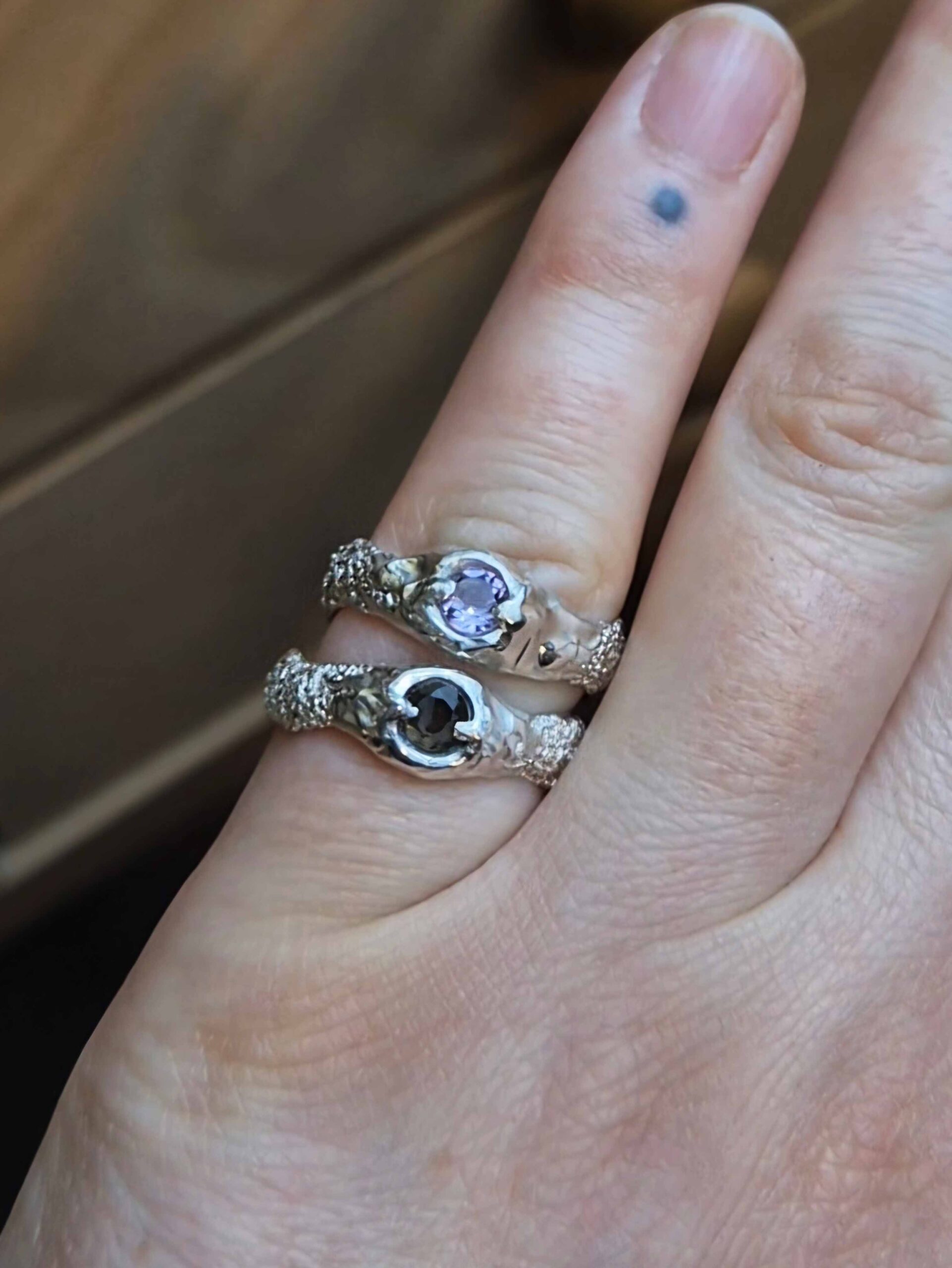 Riot jest wykonany ze srebra próby 925, a każdy pierścionek powstaje w naszej pracowni. Najpierw ręcznie rzeźbimy go w wosku jubilerskim, a potem odlewamy metodą wosku traconego, dzięki czemu każdy egzemplarz jest trochę inny i naprawdę wyjątkowy.